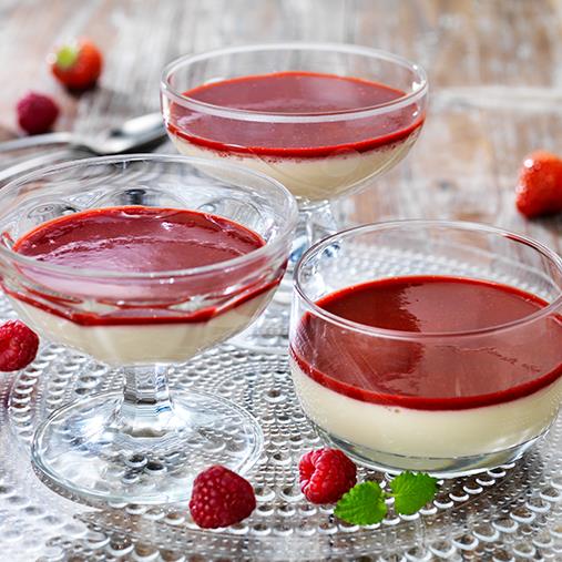 4. Tina hallonpuré och söta med florsocker. Förtjocka med Thick & Easy™. Slå över pannacottan.