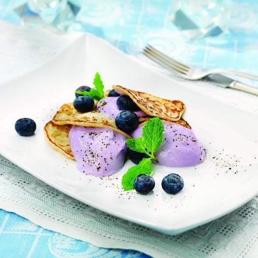 Dekorera med blåbär och citronmeliss.Plättar eller pannkakor är något som många gillar. Dessa plättar med blåbärsgott, en kräm på kesella och blåbärspuré, är ett bra alternativ att servera. Både som mellanmål och dessert.