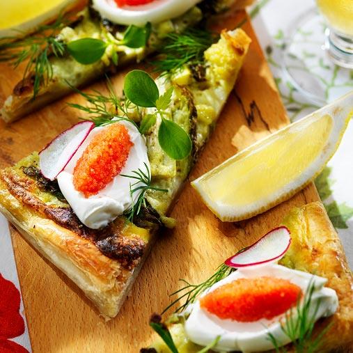 Timbalkonsistens: Ersätt smördeg med Brödtimbal, Findus 29295. Bred på mjukost och toppa med sparriskräm. Skär i läckra bitar.