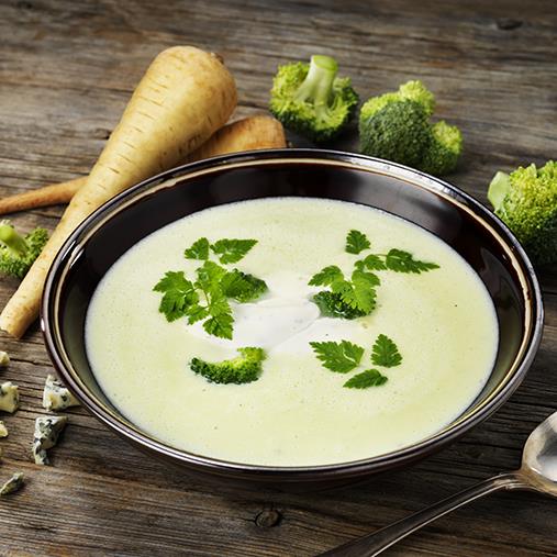 En krämig broccolisoppa med palsternacka och ädelost. Gjord på ekologisk broccolipuré samt palsternackspuré. Med puréer går det enkelt och snabbt att laga goda, mättande soppor till era gäster!