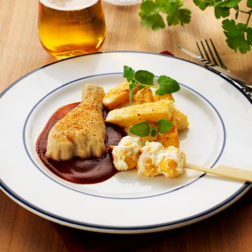 Grillad kycklingtimbal med bbq- sås och majsspett, timbal