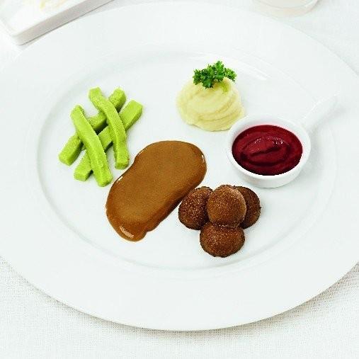 Serveras kall i form av "köttbullar" uttagna med kuljärn eller i "kuber" med tjock, varm sås bredvid, potatismos, grönsaksgelé och slät lingonsylt (se recept sid 140 i MRS eller sök recept på vår hemsida).Kötbullar i gelékonsistens är ett utmärkt alternativ att erbjuda på veckans matsedel. Gjorda på Findus oxpuré samt skinkpuré, båda av svenskt oxkött respektive nötkött.