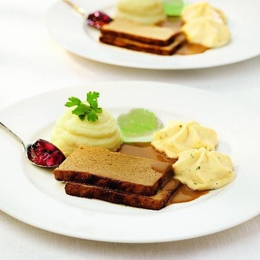 4. Pensla före servering. Skär i skivor och servera med sås, pressad potatis, grönsakstimbal och gelé.