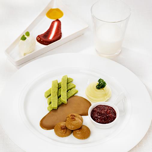 3. Servera "köttbullar" tillsammans med sås, potatismos, grönsakstimbal och lingonsylt (se recept sid 140 i MRS eller sök recept på vår hemsida).