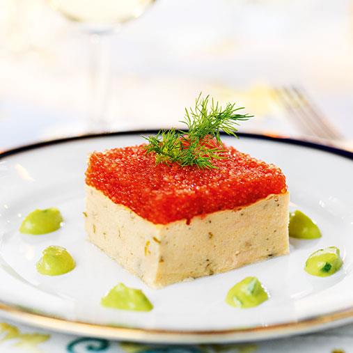 2. Grädda i ugn full ånga 125 grader ca 1 timme. Dekorera med röd stenbitsrom och dill.