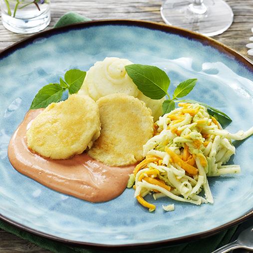 En utmärkt rätt att servera till de som önskar timbalkonsistens. Smakrik palsternacksbiff gjord på palsternackspuré. Serveras med en timbalsallad på morot, blomkål och broccoli.