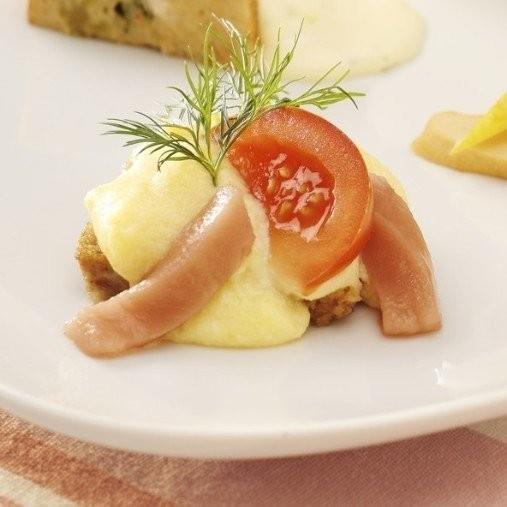 2. Värm puré och sillspad. Tillsätt det blötlagda gelatinet under omrörning. Smaksätt. Låt stelna i kyl.