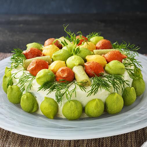Smörgåstårta är en rätt som går att variera i det oändliga. Välj de puréer och grönsakstimbaler som era boende uppskattar mest!