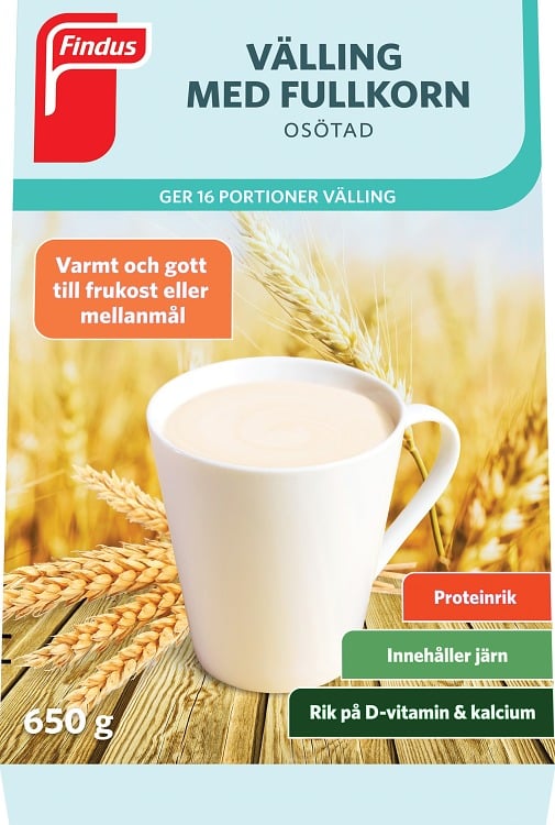 SKUMMJÖLKSPULVER, fullkornsmjöl 37 % (av VETE, HAVRE), vegetabilisk olja (solros, raps), maltodextrin, maltextrakt (av KORN), VETEKLI, joderat salt, mineralämnen (järn, zink, magnesium, jod, selen), vitaminer (A, D, E, K, C, tiamin, riboflavin, niacin, B6, folsyra, B12, biotin, pantotensyra).