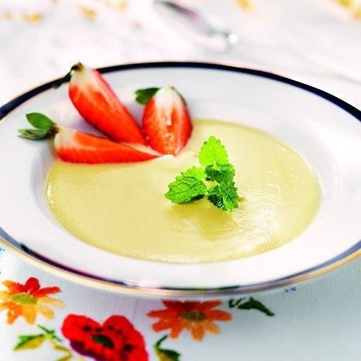 1. Blanda samtliga ingredienser. Låt sjuda upp. Servera med färska jordgubbar.