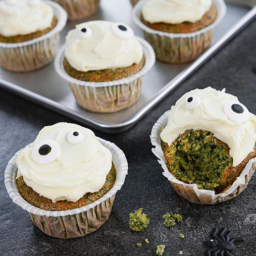 Muffins bakade med spenatpuré blir både saftiga och roliga att äta. Att baka med våra grönsakspuréer är ett väldigt bra och roligt sätt att få barnen att få i sig grönt. Testa att baka dessa monstermuffins till Halloween!