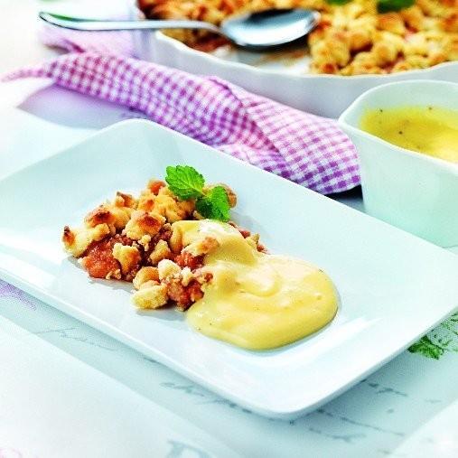 Servera med vaniljsås.Smulpaj med hallon är alltid en god och mycket uppskattad dessert att bjuda på. Med Findus frukt- och bärpuréer kan du enkelt variera fyllningen efter tycke och smak!