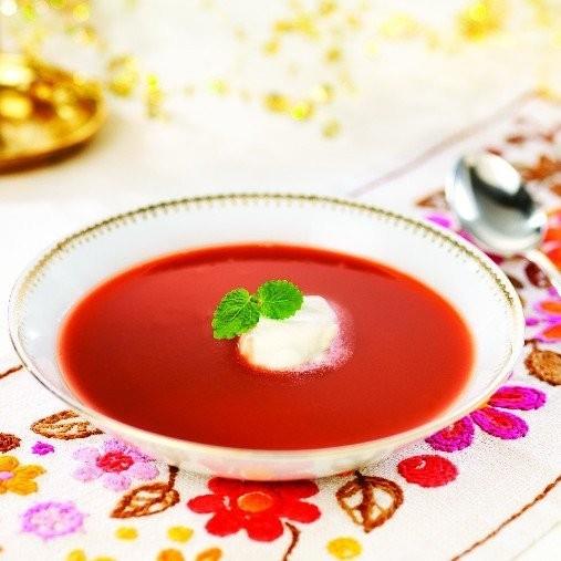 Gelékonsistens och Flytande konsistens: Fruktsoppa, (se recept sid 176) använd hallonpuré. Servera med gräddklick.