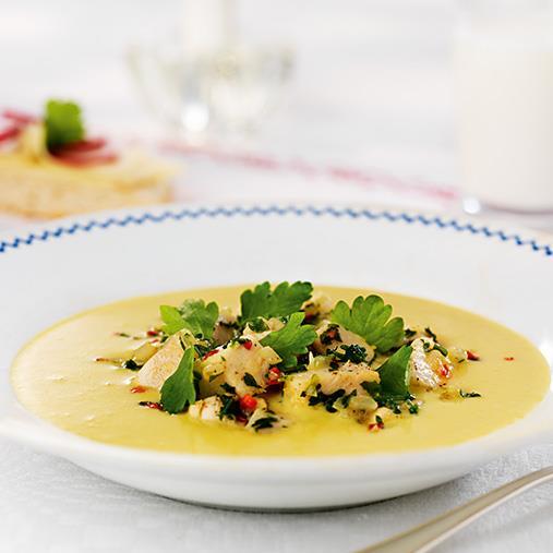 Flytande konsistens: 90 g Majspuré och 180 g Sopp- och såsbas. Servera med crème fraiche.
