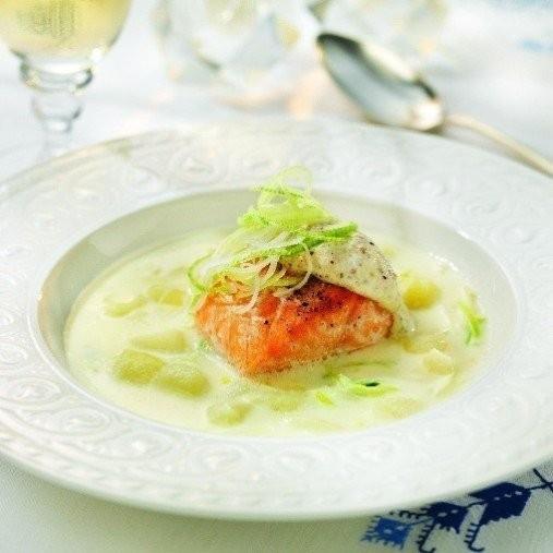 Potatis- och palsternackssoppa med lax och senapstopping