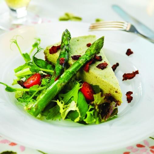 Gelékonsistens: Grön sparrisgelé, se MRS, Bacongelé, se MRS. Servera med Hollanaisesås och geléad smörgås, se MRS