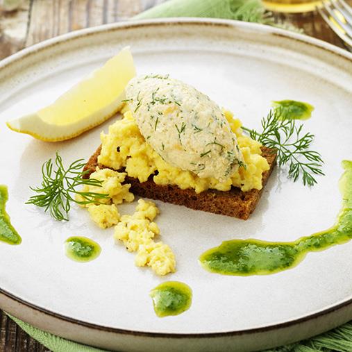En lyxig variant på toast - krämig äggröra i botten och laxmousse på Laxtimbal med röksmak. Passar bra som lättare lunch eller som ett trevligt mellanmål. Går även att göra i timbalkonsistens.