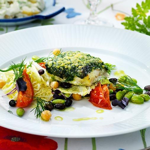 Spenat- och purjolöksbakad fisk med jordärtskocksstuvad potatis