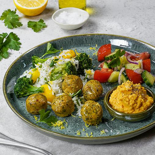 Krispig, smakrik falafel med ris och en smarrig hummus på bland annat morot. En rätt som passar utmärkt att servera på lunchmenyn, både till stora och små gäster.