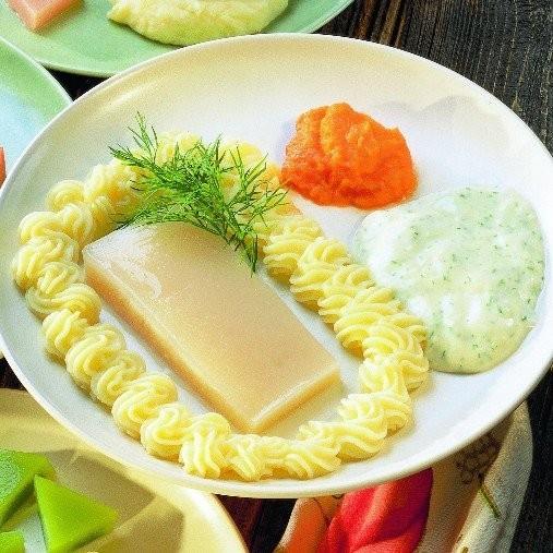 Serveras kall med tjock, varm dillsås (torkad stött dill) bredvid, spritsa gärna potatismos runt "fiskbiten".Smakfull fiskgratäng i gelékonsistens som serveras tillsammans med en god, värmande dillsås och spritsad potatismos. Testa detta till en av veckans middagar.