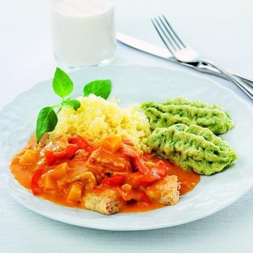 2. Bryn löken i matfettet och curry. Tillsätt paprika, äpple, passerad tomat, buljong och grädde.