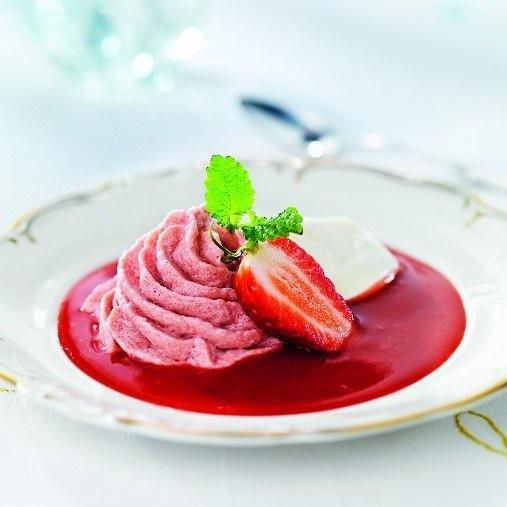 Servera moussen med en klick vaniljsås samt en fruktsås gjord på jordgubbspuré sötat med florsocker. Förtjocka eventuellt med Thick & Easy™.