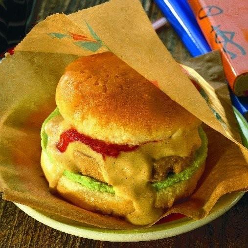 1. Placera burgaren mellan bröden. Servera med salladsblad (tunnt skuren böntimbal), ketchup, lökpulver, grillkrydda och slät hamburgerdressing.TIPS!