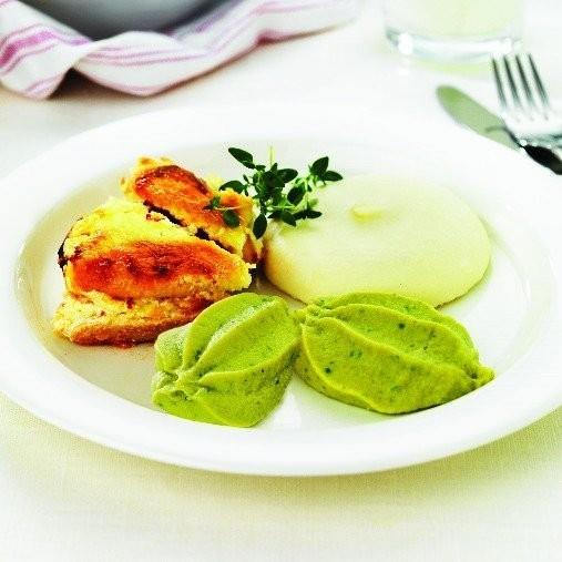 Servera med Ristimbal, Findus 61965, grönsakstimbal och sås.Här är ett utmärkt middagstips för veckan! Kasslergratäng med ananas och tomat. Det är lagat i timbalkonsistens och är rikt på många goda smaker.