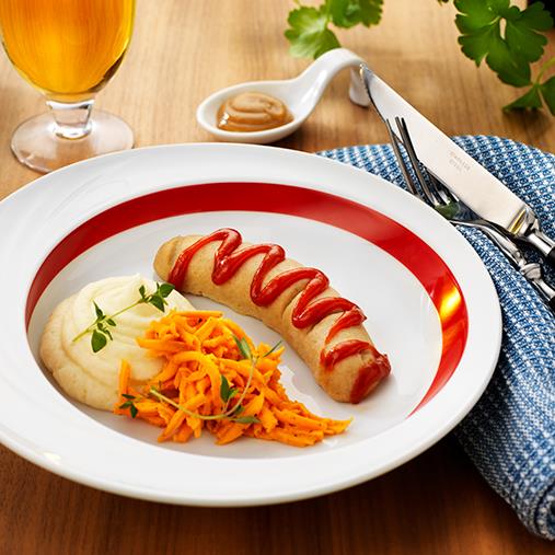 2. Servera korvtimbalen med potatismos, morotssallad, gurkkräm.