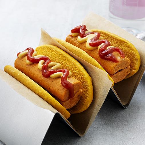 3. Ta två brödtimbaler och sätt ihop till ett korvbröd. Ta sedan två korvtimbaler och lägg ihop i korvbrödet.