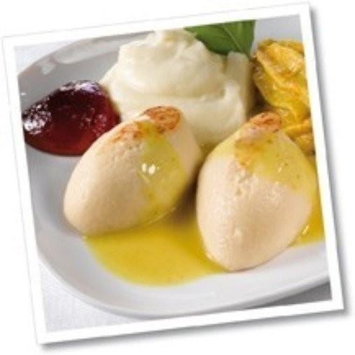 Skär upp "kycklingbröst" och servera med sås, pressad potatis och grönsakstimbal.Servera kokt kyckling i timbalkonsistens med goda tillbehör som en av veckans middagsrätter.