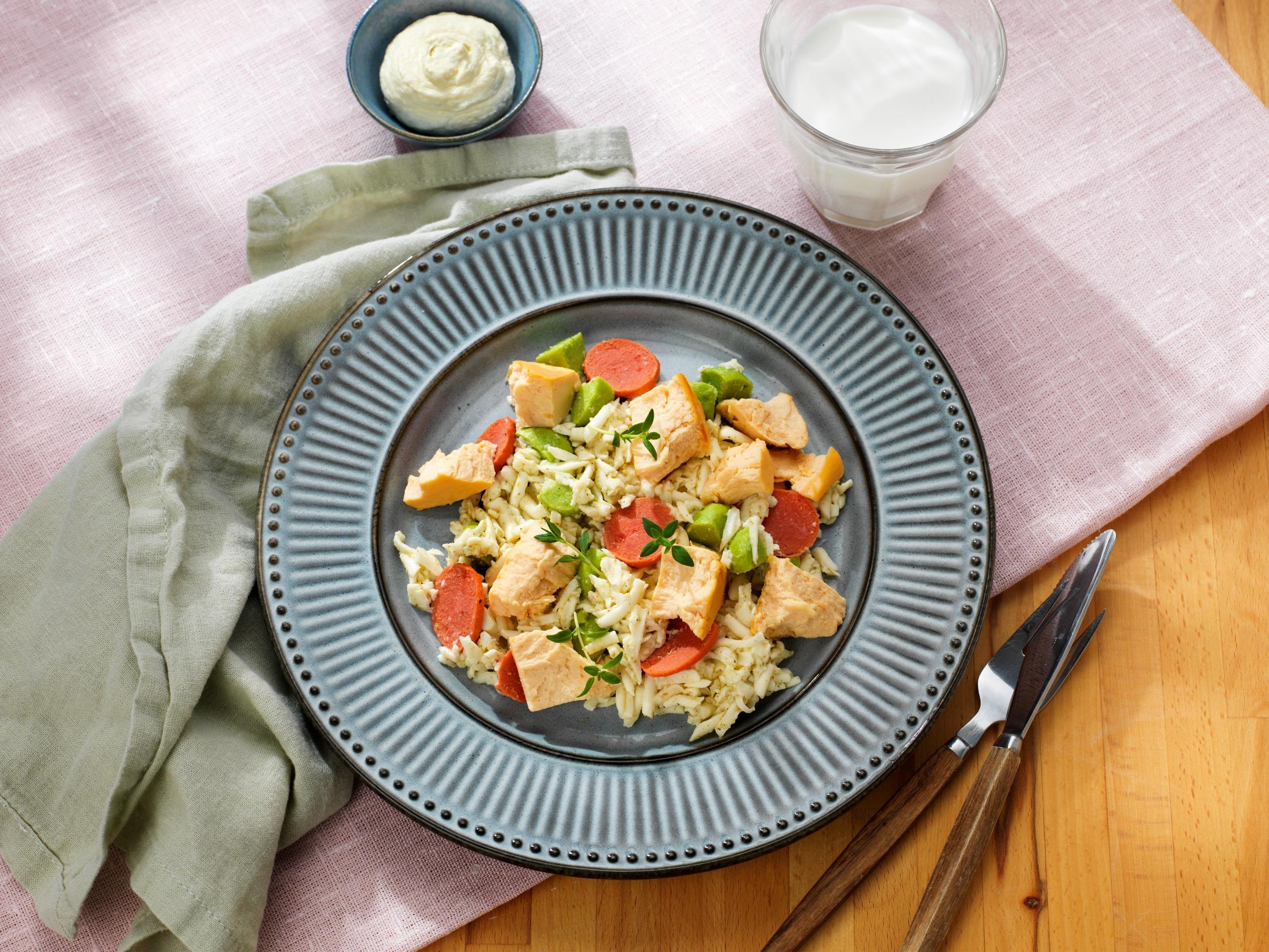 Potatiskräm med lax och grönsaker, timbal