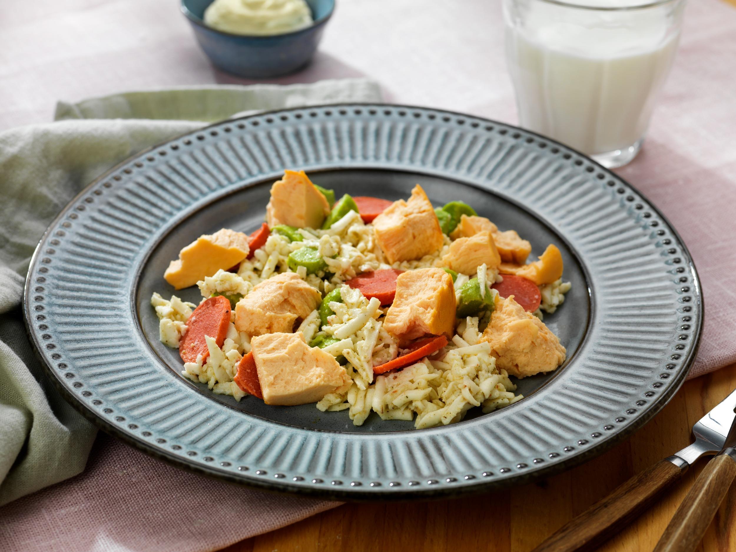 Värm laxtimbaler enligt anvisning och bryt till bitar och servera på toppen av salladen.