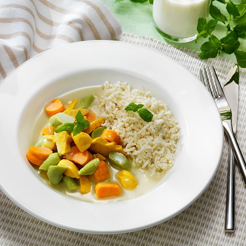 Pressa ristimbalen genom potatispressen eller dela i bitar.Vegetarisk gryta på asiatiskt vis, baserad på kokosmjölk och grön curry. Dessutom i lättuggad timbalkonsistens! En modern rätt som även de med tugg- och sväljsvårigheter kan njuta av.