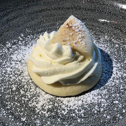 2. Späd och rör ut potatisen med ovispad vispgrädde till mandelmasskonsistens och smaksätt med några droppar bittermandelessens och florsocker.